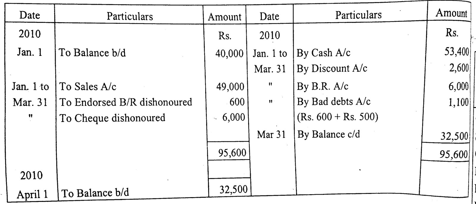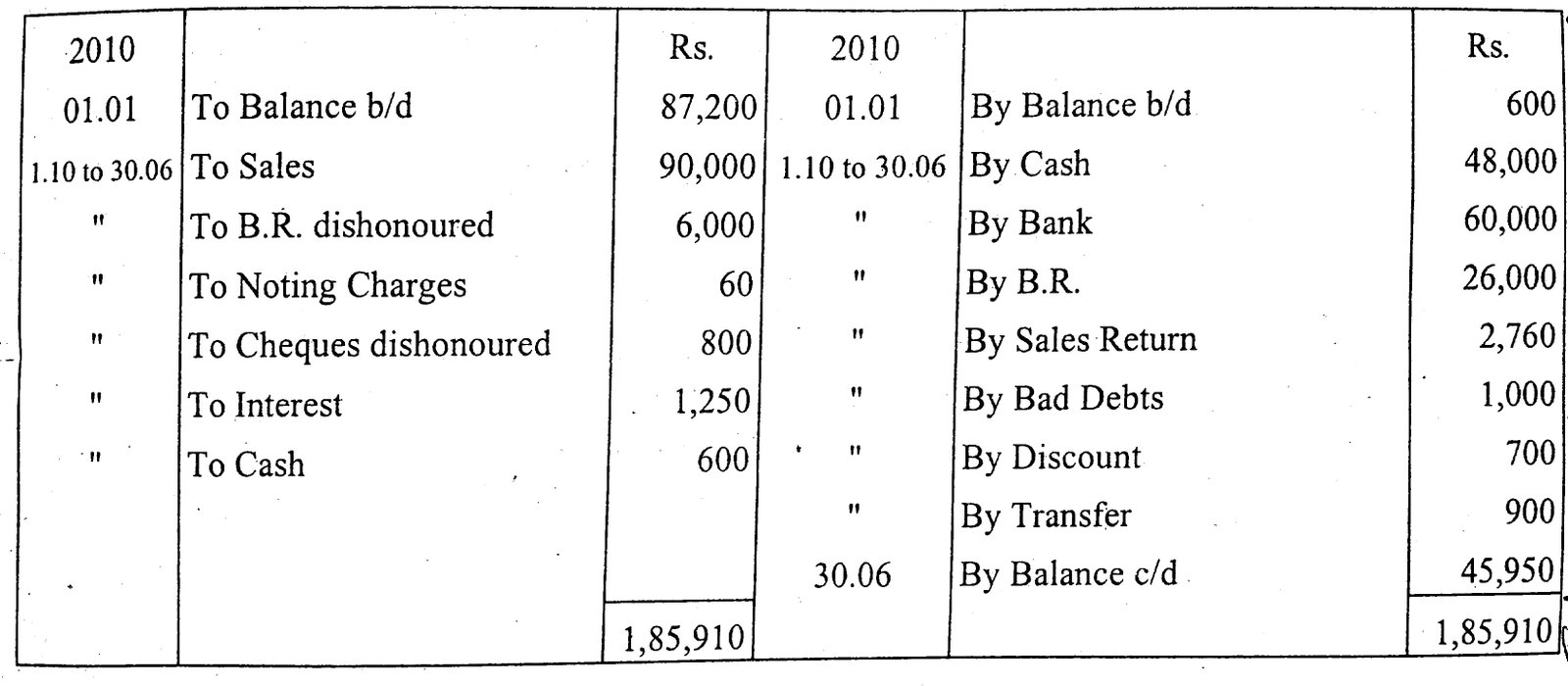 Debit balance of debtors Accounts as on 1 January 2010 87,200. and credit balance 600 transactions for 6 months and had 30 June 2010.