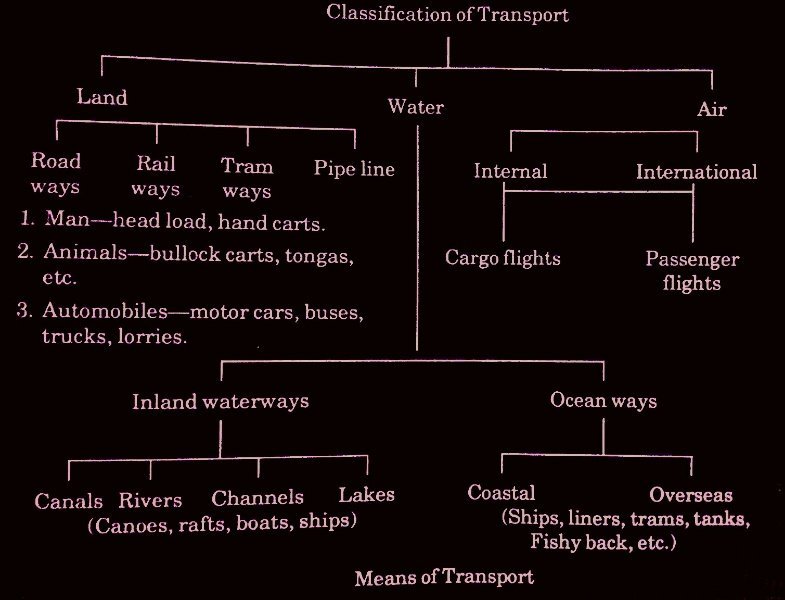The elements or types of transportation are classified into four: the way, the vehicle, the motive power used, and the terminals. The way may be natural or artificial.